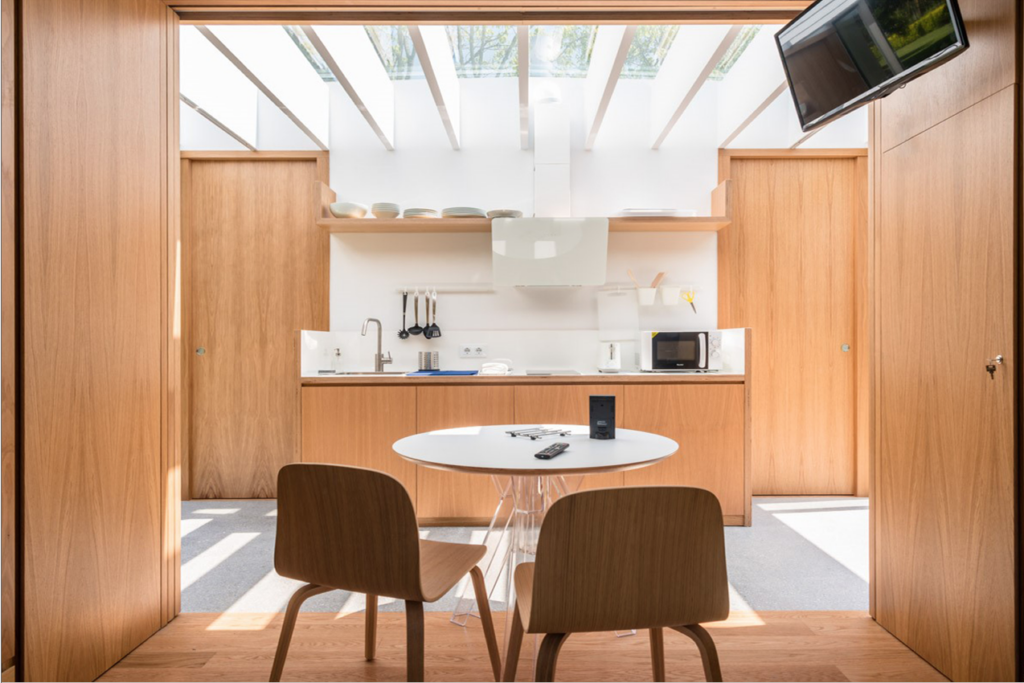- Cafetera, tostador, microondas, nevera y vajilla
