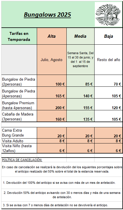 Hay un bungalow de madera para 4 personas, diez de piedra (5 para 2 personas y 5 para 4 personas) y 3 bungalows PREMIUM No se realizará limpieza diaria, se cambia la ropa de cama cada 4 días y las toallas en principio cada 4 días. Hay Barbacoas a disposición de los huéspedes alojados en los bungalows. |